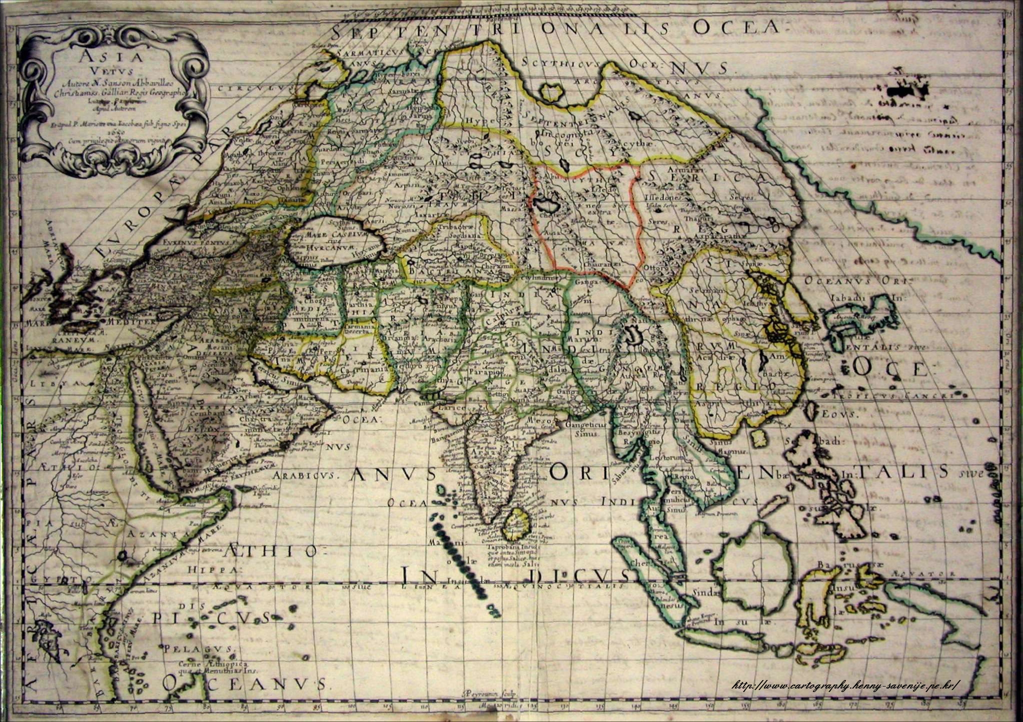 Asia Vetus N. Sanson Abbavillaeo Christianiss. Galliar. Regis Geographo. Lut[....] Parisiis Apud Auctorem Et Apud Petrum Mariette via Iacobaea sub signo spei. 1650. Cum Privilegio Annorum Viginti. [Latin] Old Asia, Cartographer: Nicolas d'Abbeville Sanson, [1600-1667] Royal Geographer At Paris by the author and by Pierre Mariette, rue S. Iacques a l'Esperiance [address] 1650 at the benefit of the 20th anniversary of the king. [translation]